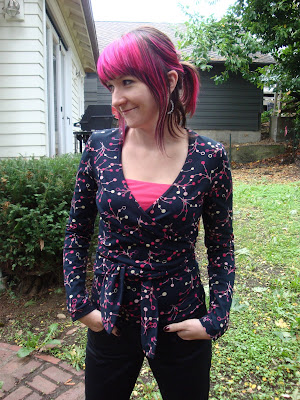 I'm naming this my Tessuti Wrap Top because the fabric was a gift from the very generous Colette at Tessuti Fabrics. I felt compelled to get this done while my hair is still pink so I could look completely matchy-matchy coordinated.